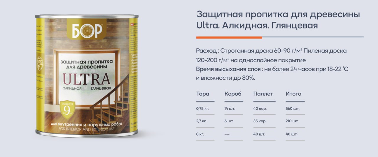 Отлично пропитывает и защищает древесину от биологических повреждений (синевы, плесени, гнили, грибка), отпугивает деревопоражающих насекомых, значительно продлевает срок службы деревянных изделий. Бесцветная пропитка позволяет длительно сохранять натуральный вид древесины, цветные — имитируют ценные породы дерева, сохраняя его природную текстуру. Все цвета можно смешивать между собой, а также осветлять бесцветной пропиткой для древесины ULTRA ТМ"БОР». После высыхания образует эластичное глянцевое покрытие. Двойной УФ-фильтр надежно защищает поверхность от выцветания, а натуральный микровоск защищает поверхность от воздействия влаги.